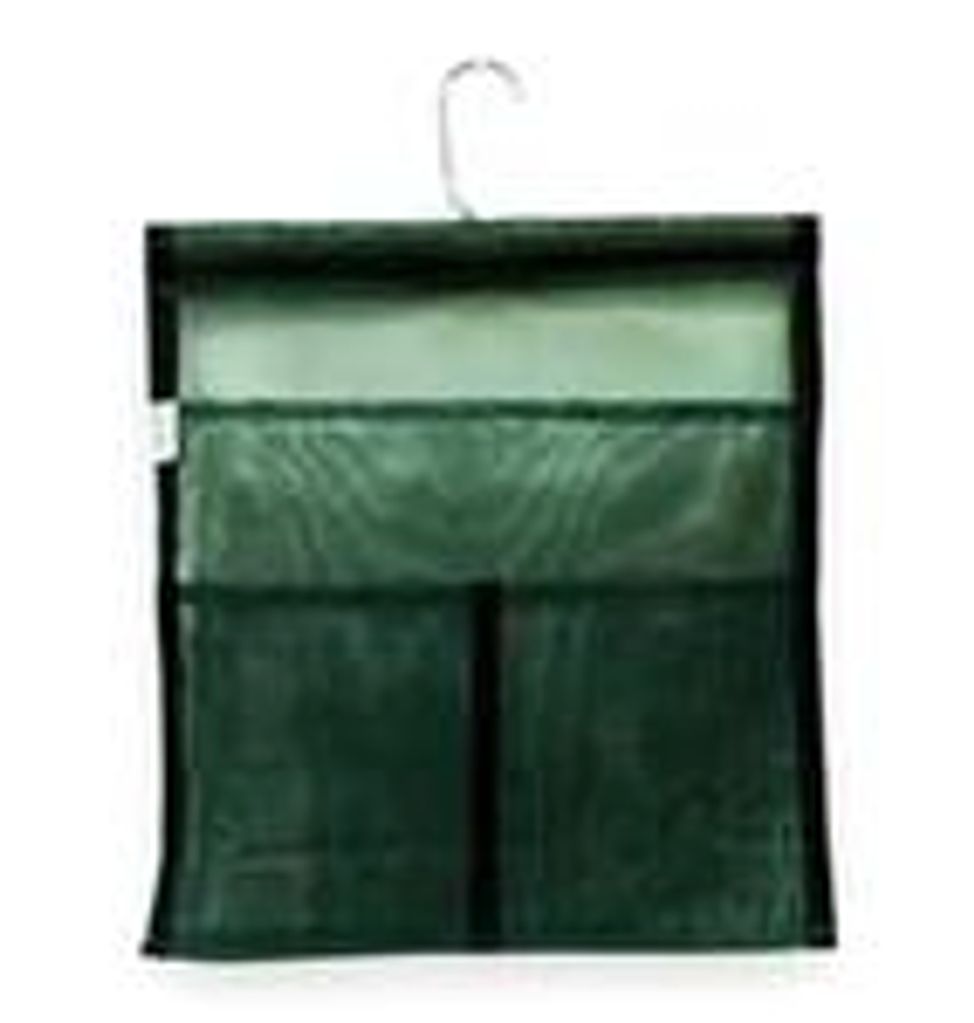 This convenient bag is 18" wide by 18" tall and features two small pockets 9"wide 10"tall in the front, and one large pocket 17" Wide and 13" tall. Green mesh is wrapped around a wooden hanger with a steel hook making this storage option sturdy to hold anything you need it to.