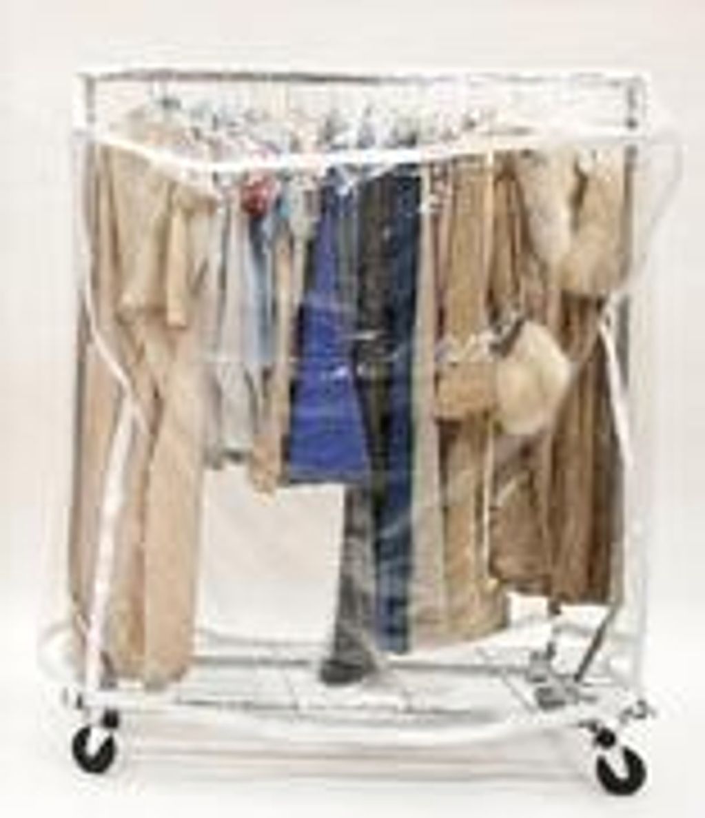 Protect racks of clothes on the go or for storage. Available in clear plastic or blue plasticanvas, see sizes. Also available in disposable (one size fits all racks).